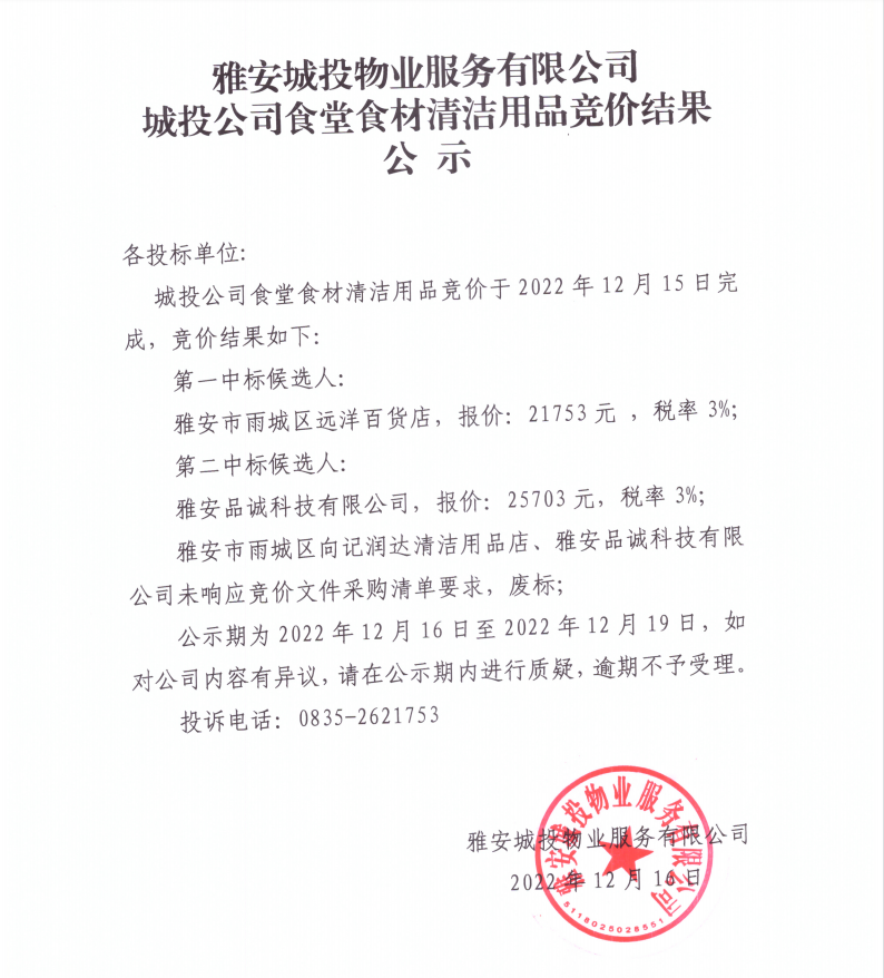 雅安城投物業(yè)服務有限公司城投公司食堂食材清潔用品競價結(jié)果公示