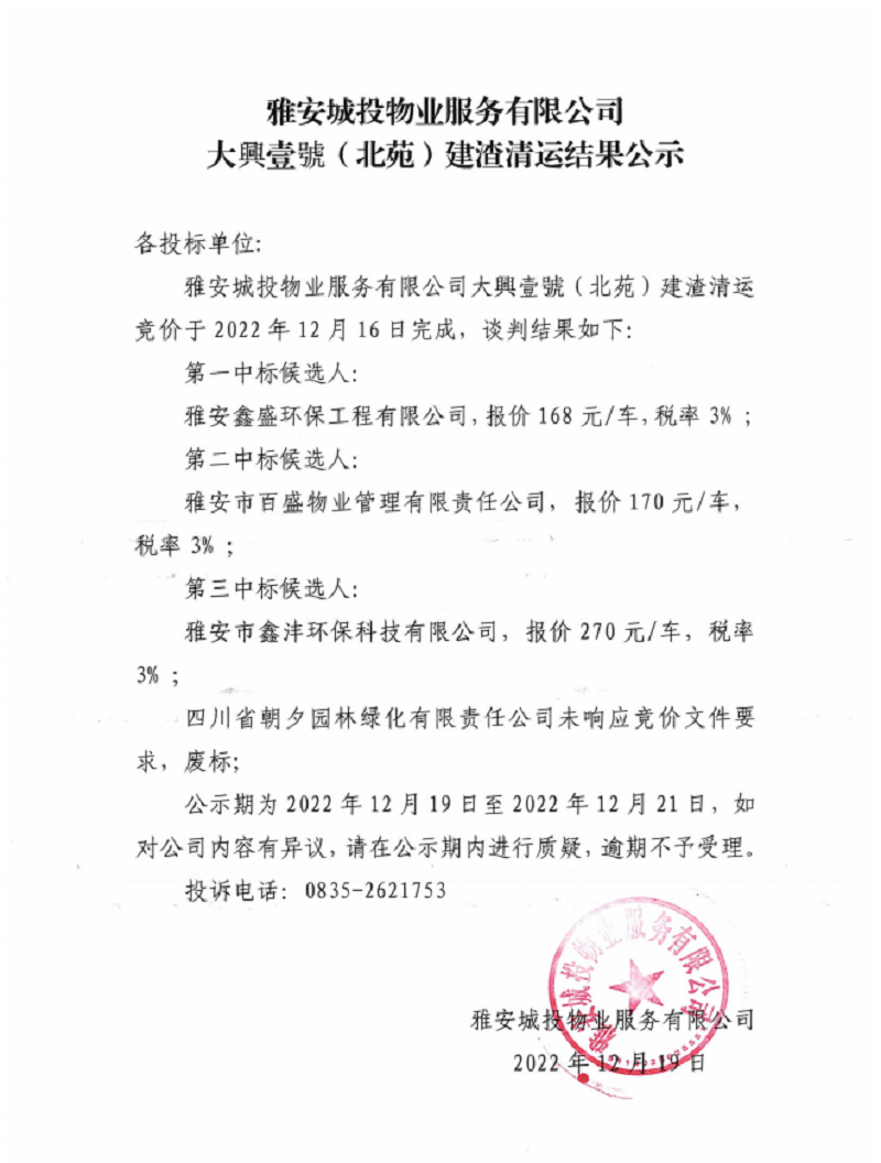 雅安城投物業(yè)服務有限公司大興壹號(北苑)建渣清運結果公示