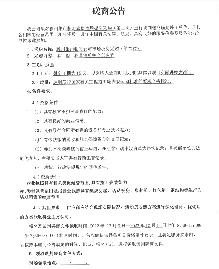 雅州集市臨時農貿市場板房采購(第二次)磋商公告