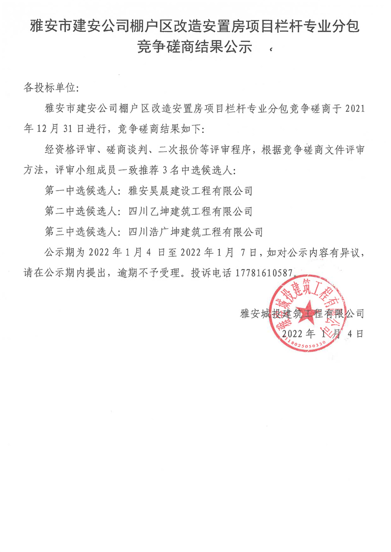 雅安市建安公司棚戶區(qū)改造安置房項目欄桿專業(yè)分包競爭磋商結(jié)果公示