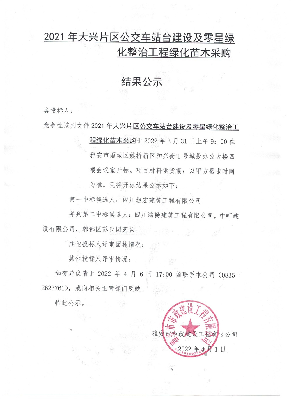 2021年大興片區(qū)公交站臺建設(shè)及零星綠地整治工程綠化苗木采購結(jié)果公示