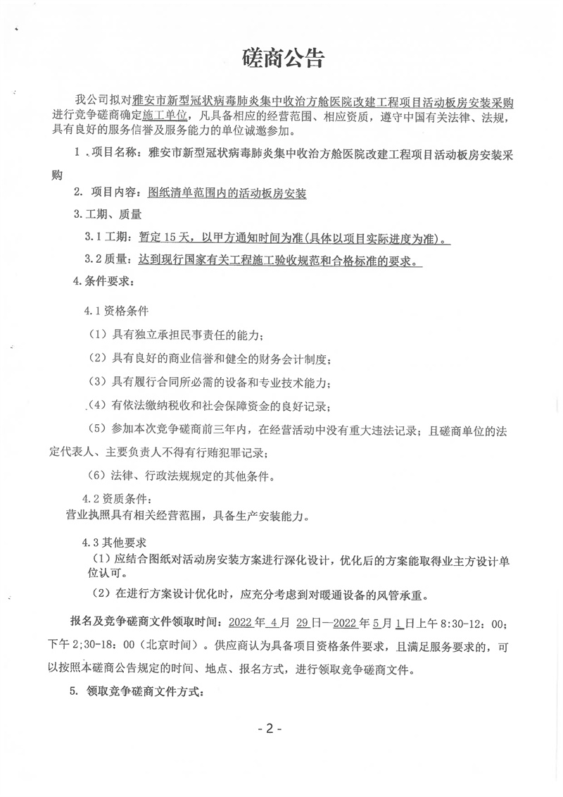 雅安市新型冠狀病毒肺炎集中收治方艙醫(yī)院改建工程項(xiàng)目活動(dòng)板房采購磋商公告