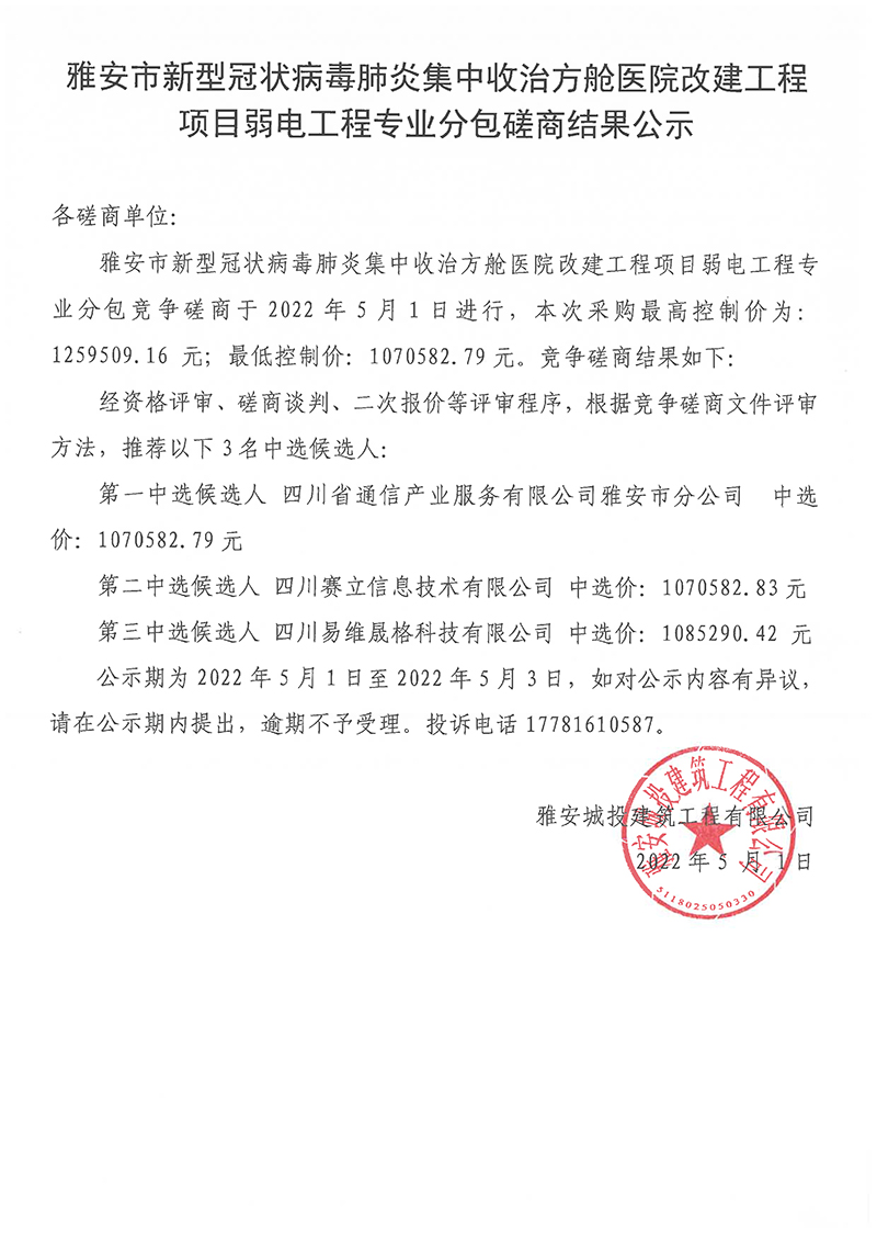 雅安市新型冠狀病毒肺炎集中收治方艙醫(yī)院改建工程項(xiàng)目弱電工程專(zhuān)業(yè)分包磋商結(jié)果公示