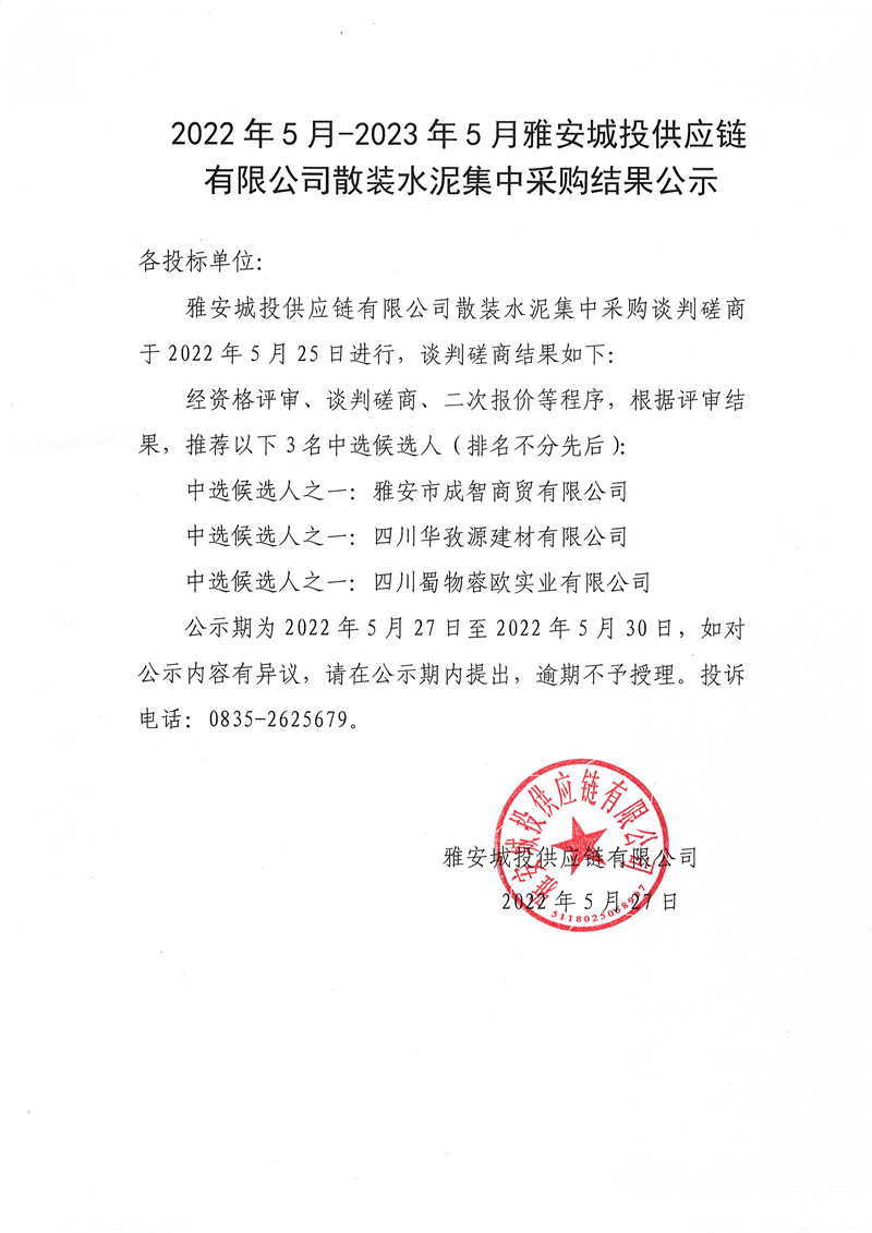 2022年5月-2023年5月雅安城投供應(yīng)鏈有限公司散裝水泥采購結(jié)果公示