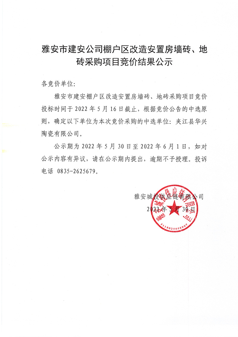 雅安市建安公司棚戶區(qū)改造安置房墻磚、地磚采購競價項目競價結(jié)果公示
