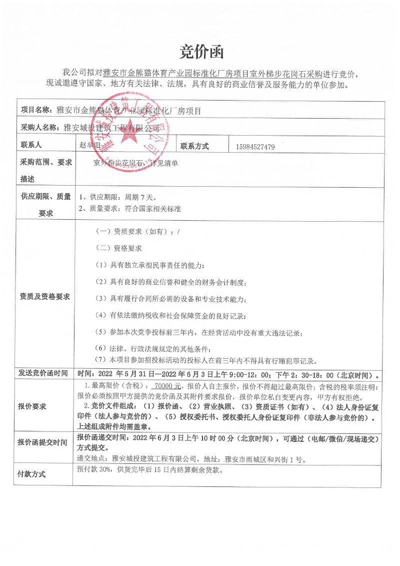 雅安市金熊貓體育產(chǎn)業(yè)園標準化廠房項目室外梯步花崗石采購競價函