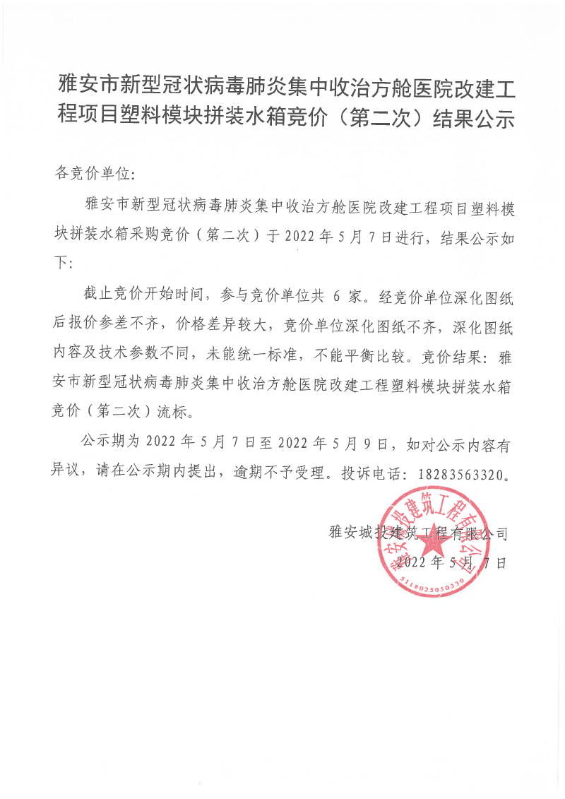 雅安市新型冠狀病毒肺炎集中收治方艙醫(yī)院改建工程項目塑料模塊拼裝水箱競價(第二次)結果公示