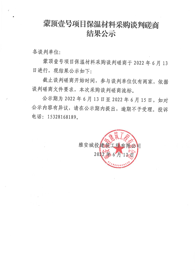 蒙頂壹號(hào)項(xiàng)目保溫材料采購(gòu)談判磋商結(jié)果公示