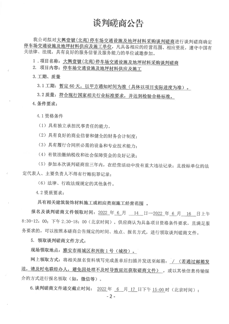 大興壹號(hào)(北苑)停車場交通設(shè)施及地坪材料采購談判磋商公告