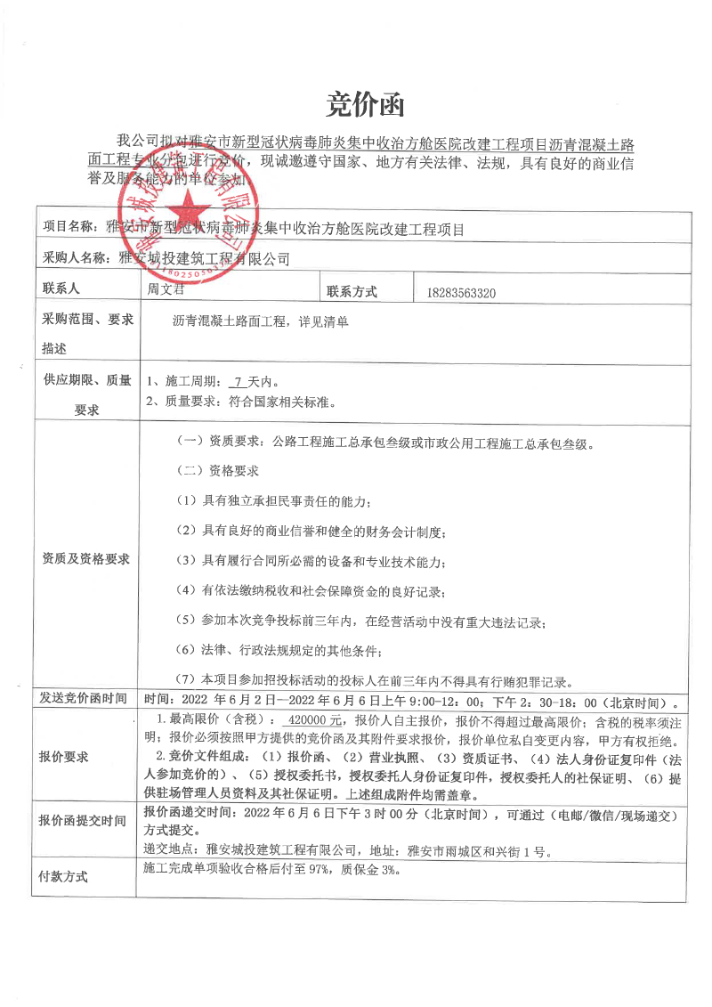 雅安市新型冠狀病毒肺炎集中收治方艙醫(yī)院改建工程項(xiàng)目瀝青混凝土路面工程專業(yè)分包競價函