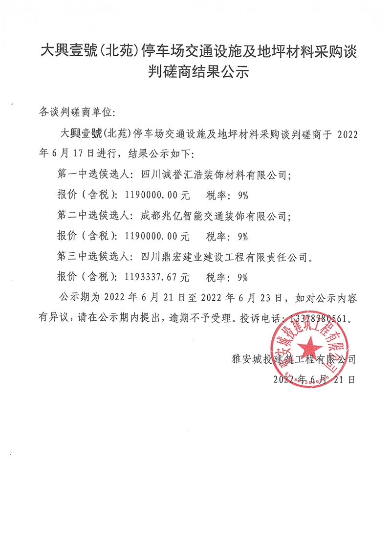 大興壹號(hào)(北苑)停車場(chǎng)交通設(shè)施及地坪材料采購(gòu)談判磋商結(jié)果公示