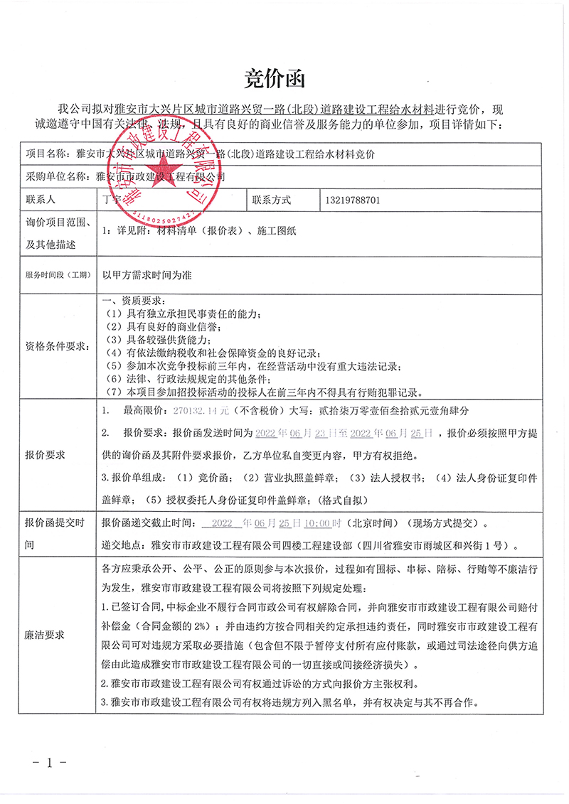 雅安市大興片區(qū)城市道路興貿(mào)一路(北段) 道路建設(shè)工程給水材料采購(gòu)公告