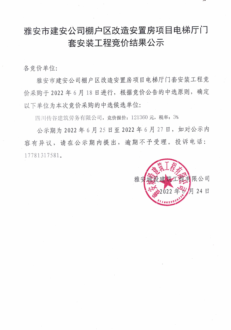 雅安市建安公司棚戶區(qū)改造安置房項目項目電梯廳門套安裝工程競價結(jié)果公示