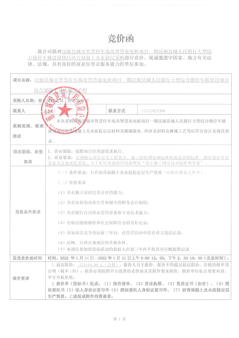 漢源縣城市智慧停車場及智慧充電樁項目一期漢源縣城人民銀行大型綜合樓停車樓建設項目瀝青混凝土、水穩(wěn)層采購競價公告