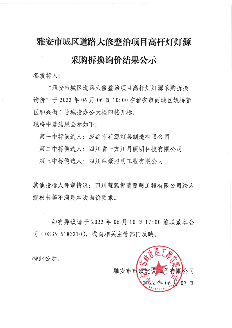 雅安市城區(qū)道路大修整改項(xiàng)目高桿燈燈源采購(gòu)拆換詢價(jià)結(jié)果公示