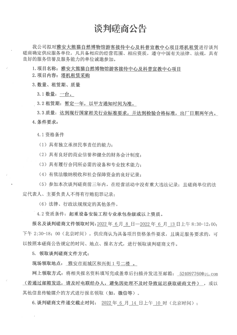 雅安大熊貓自然博物館游客接待中心及科普宣教中心項目塔機租賃談判磋商公告