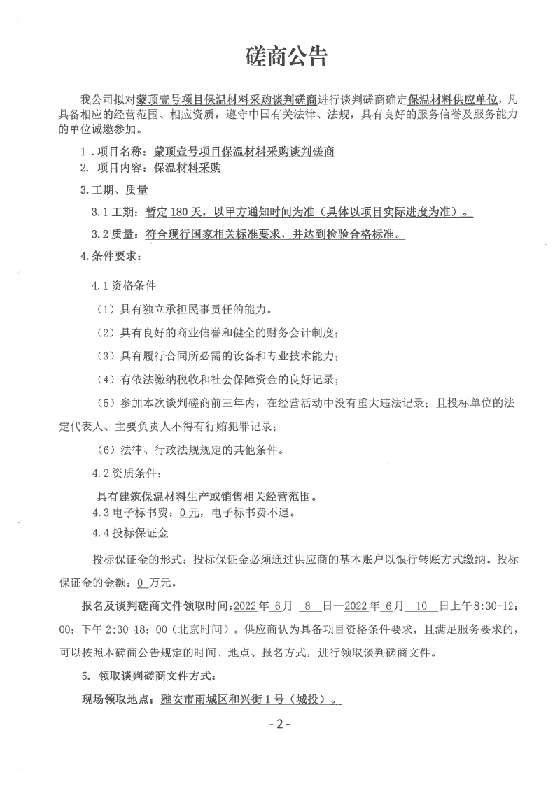蒙頂壹號項(xiàng)目保溫材料采購談判磋商公告