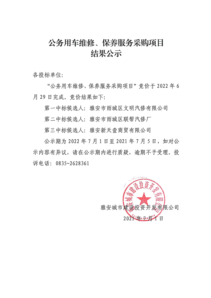 雅安城市建設(shè)投資開發(fā)有限公司 公務(wù)用車維修、保養(yǎng)服務(wù)采購項(xiàng)目結(jié)果公示