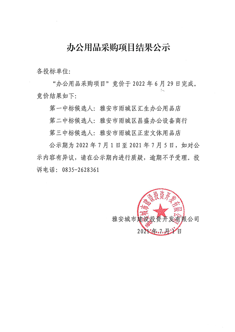 雅安城市建設投資開發(fā)有限公司辦公用品采購項目競價結果公示