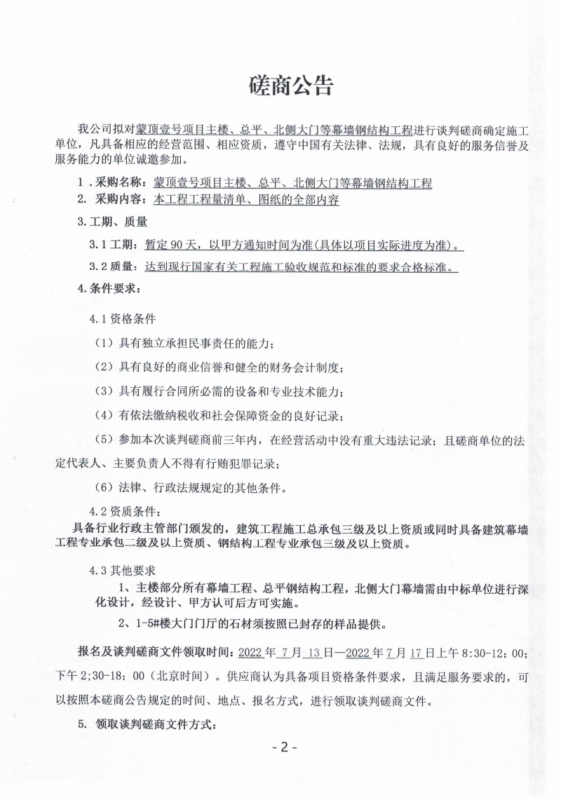 蒙頂壹號項(xiàng)目主樓、總坪、北側(cè)大門幕墻鋼結(jié)構(gòu)工程談判磋商公告