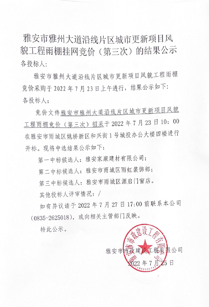 雅安市雅州大道沿線片區(qū)城市更新項目風(fēng)貌工程雨棚競價(第三次)的結(jié)果公示