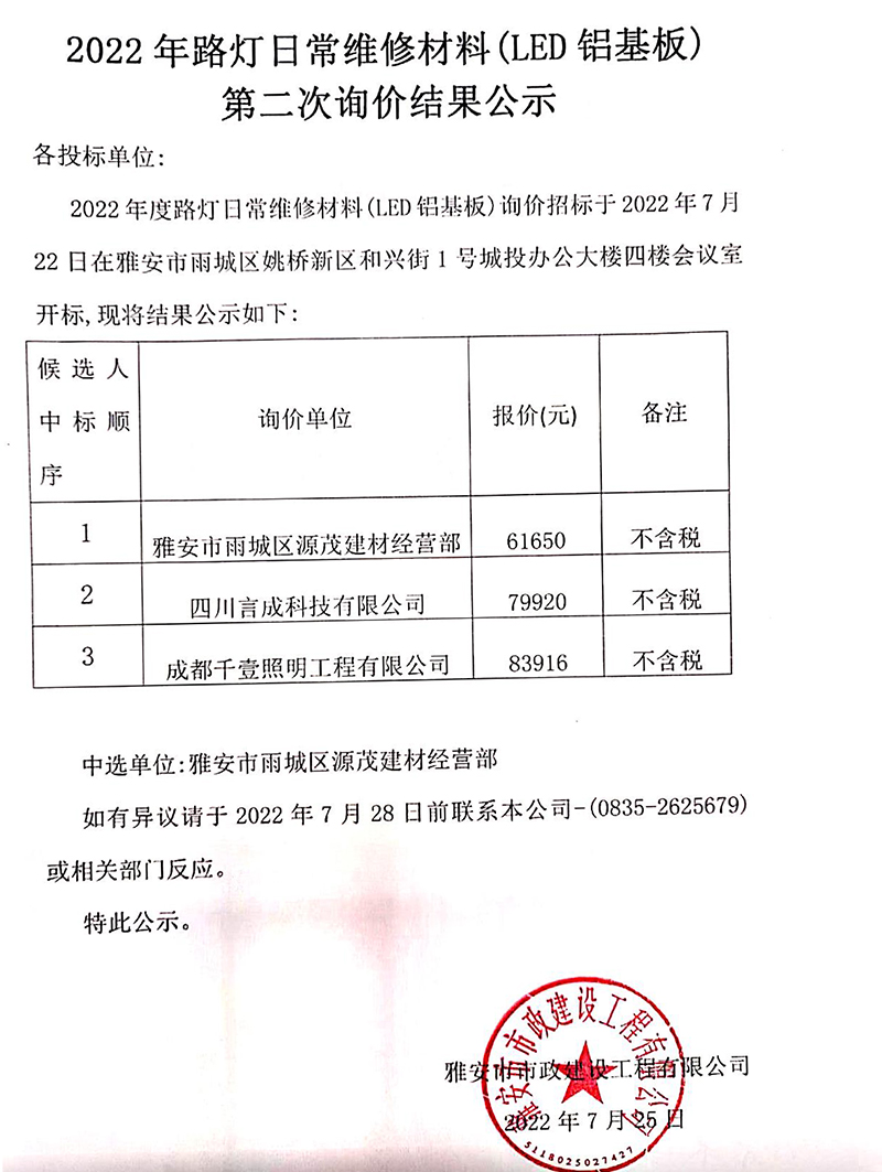 2022年路燈日常維修材料(LED鋁基板)第二次詢(xún)價(jià)結(jié)果公示