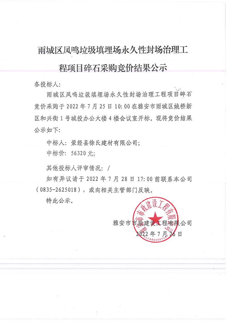 雨城區(qū)鳳鳴垃圾填埋場(chǎng)永久性封場(chǎng)治理工程項(xiàng)目碎石采購(gòu)競(jìng)價(jià)結(jié)果公示