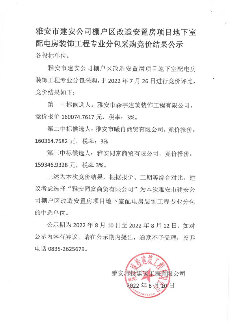雅安市建安公司棚戶區(qū)改造安置房項目地下室配電房裝飾工程專業(yè)分包競價結(jié)果公示