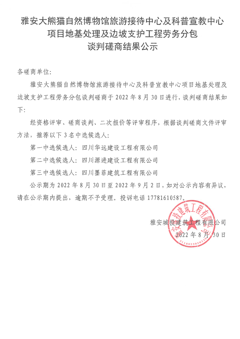 雅安大熊貓自然博物館旅游接待中心及科普宣教中心項(xiàng)目地基處理及邊坡支護(hù)工程勞務(wù)分包談判磋商結(jié)果公示
