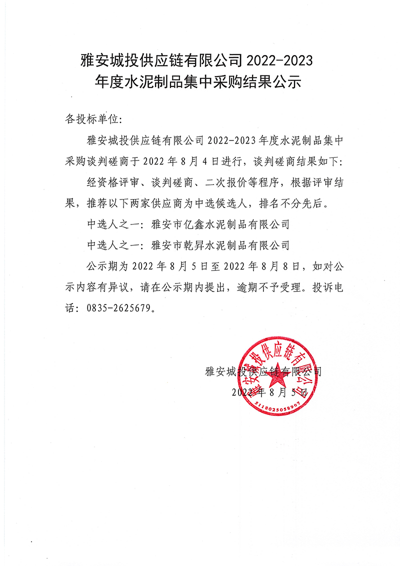 雅安城投供應鏈有限公司2022-2023年度水泥制品集中采購結果公示