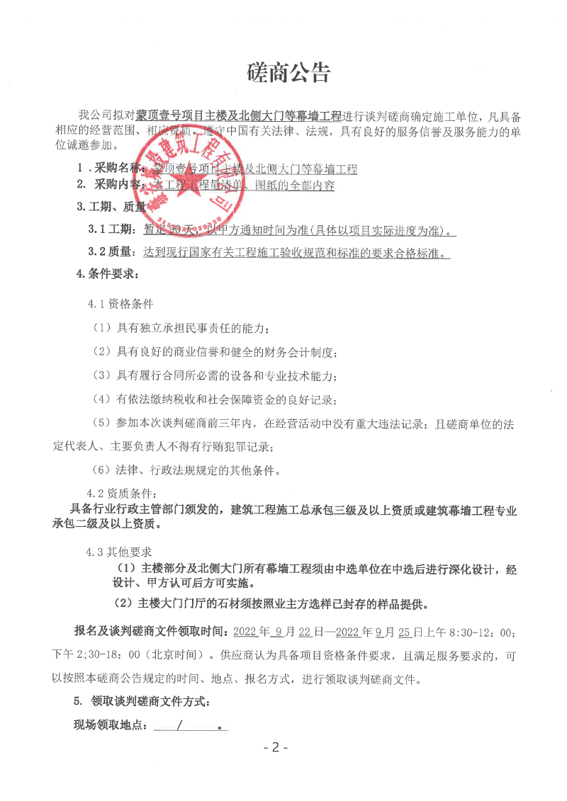 蒙頂壹號(hào)項(xiàng)目主樓及北側(cè)大門(mén)等幕墻工程談判磋商公告