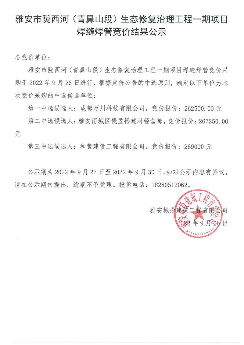 雅安市隴西河(青鼻山段)生態(tài)修復(fù)治理工程一期項目焊縫焊管采購競價結(jié)果公示