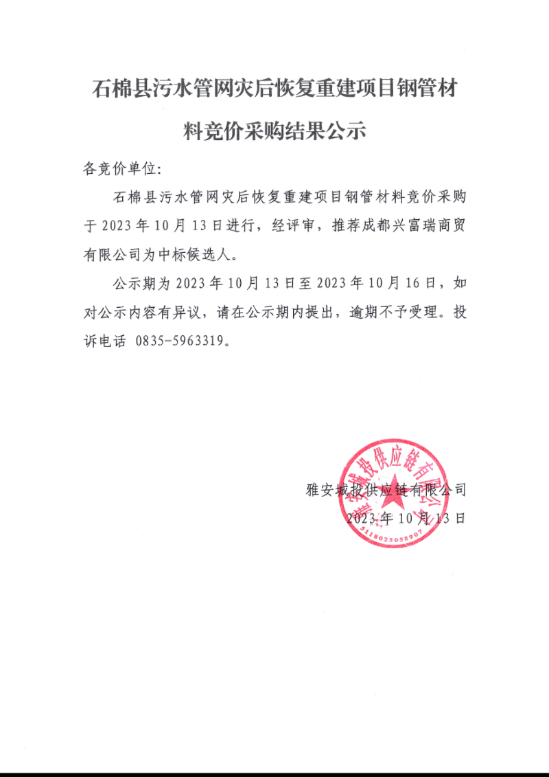 石棉縣污水管網(wǎng)災(zāi)后恢復(fù)重建項目鋼管材料競價采購結(jié)果公示