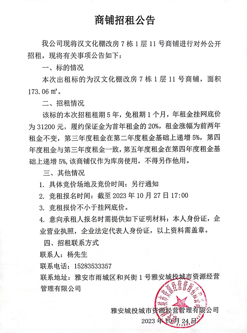 漢文化棚改房7棟1層11號(hào)商鋪招租公告
