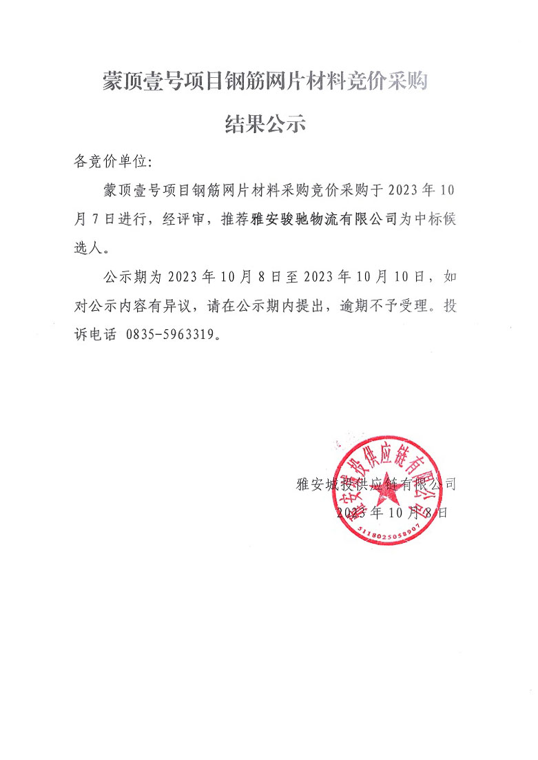 蒙頂壹號項目鋼筋網(wǎng)片材料競價采購結(jié)果公示