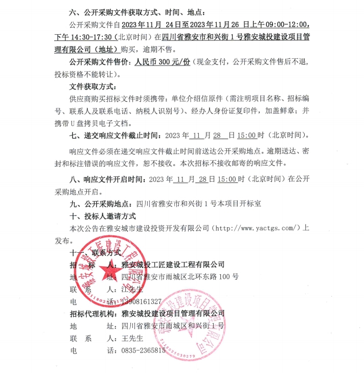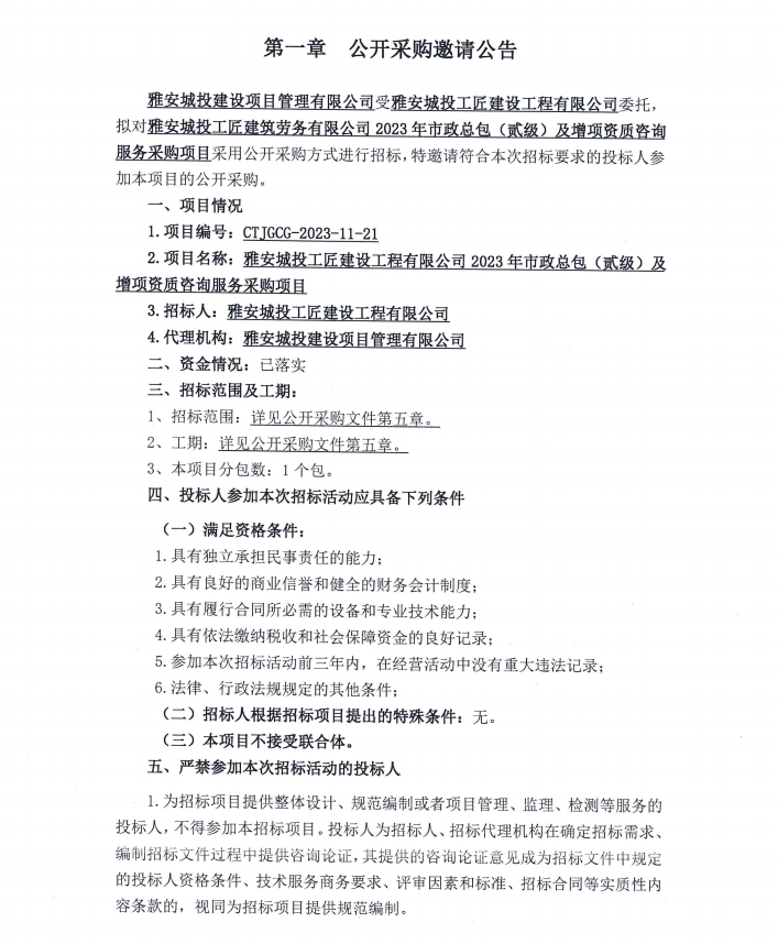 雅安城投工匠建設(shè)工程有限公司2023年市政總包(貳級(jí))及增項(xiàng)資質(zhì)咨詢服務(wù)采購項(xiàng)目公開采購邀請(qǐng)公告
