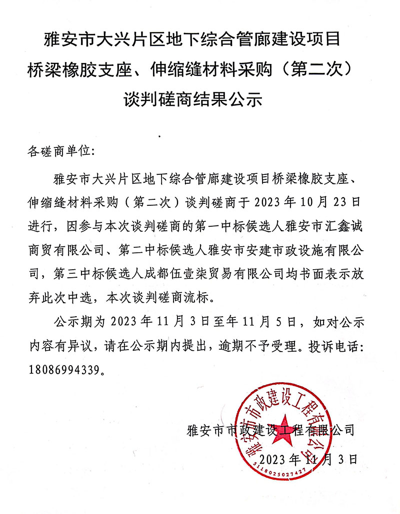 雅安市大興片區(qū)地下綜合管廊建設(shè)項目橋梁橡膠支座、伸縮縫材料采購(第二次)談判磋商結(jié)果公示