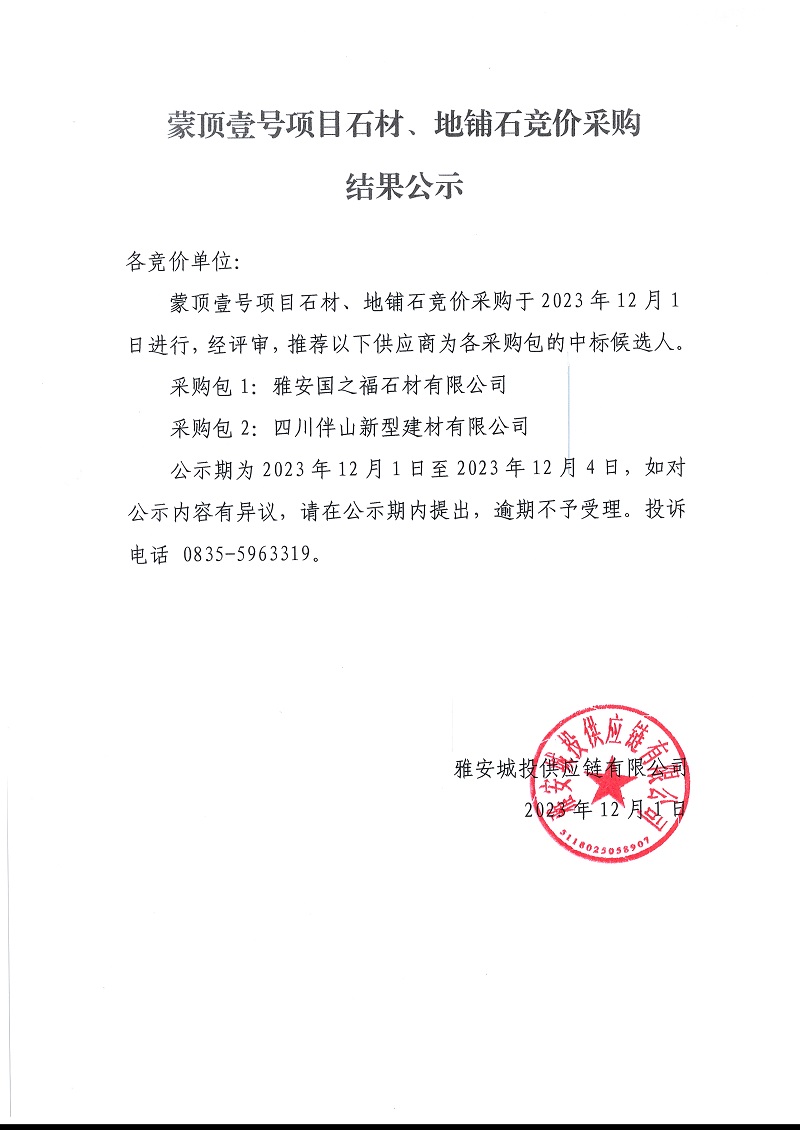 蒙頂壹號項目石材、地鋪石競價采購結(jié)果公示