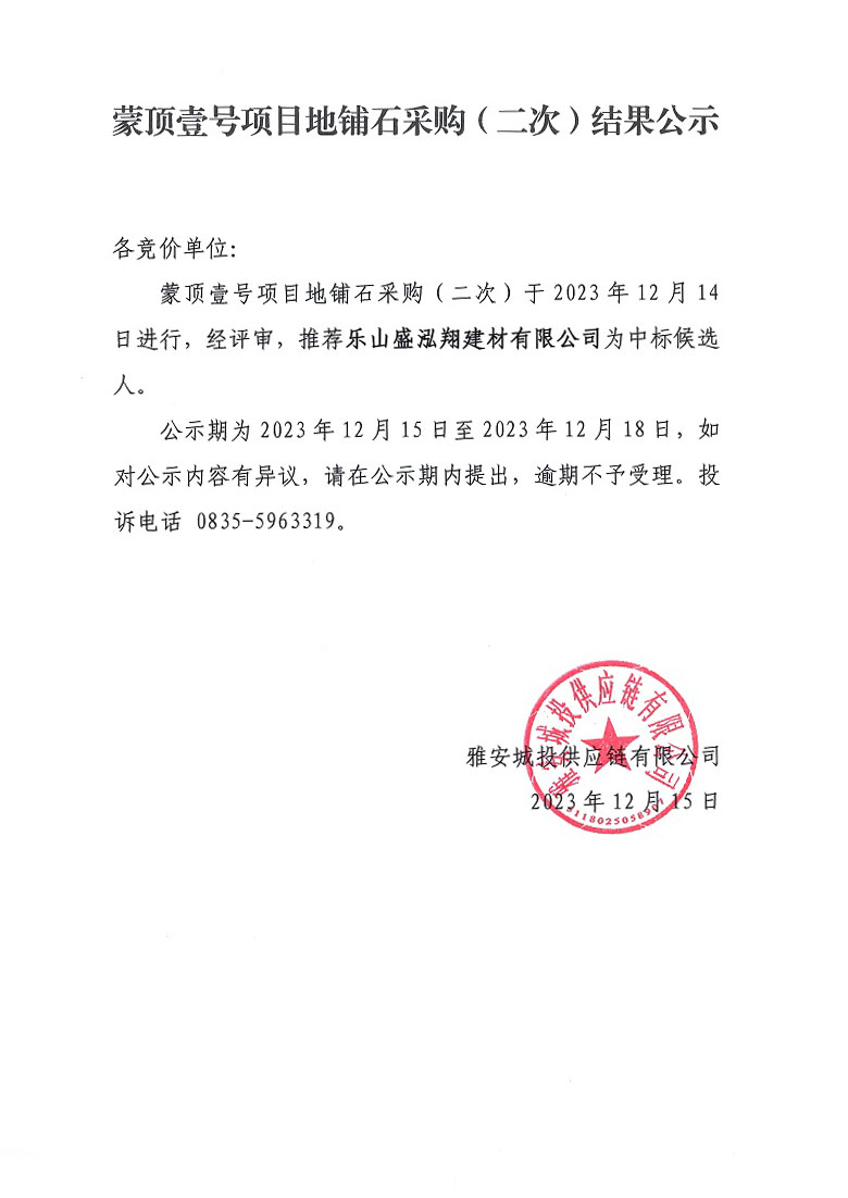 蒙頂壹號項目地鋪石采購(二次)結(jié)果公示