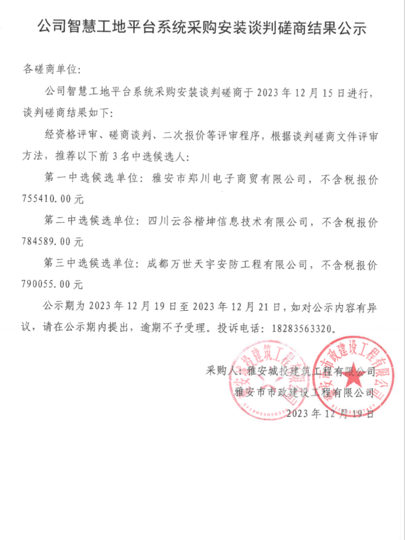 公司智慧工地平臺系統(tǒng)采購安裝談判磋商結(jié)果公示