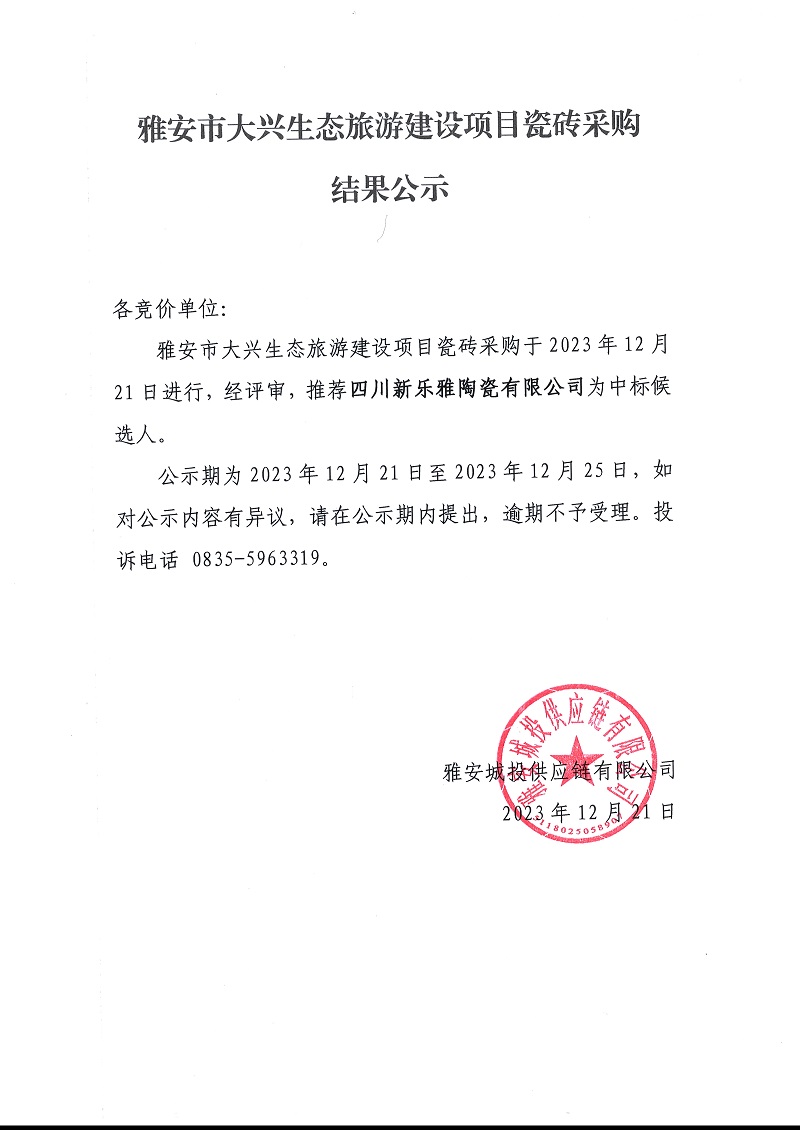 雅安市大興生態(tài)旅游建設(shè)項(xiàng)目瓷磚采購結(jié)果公示