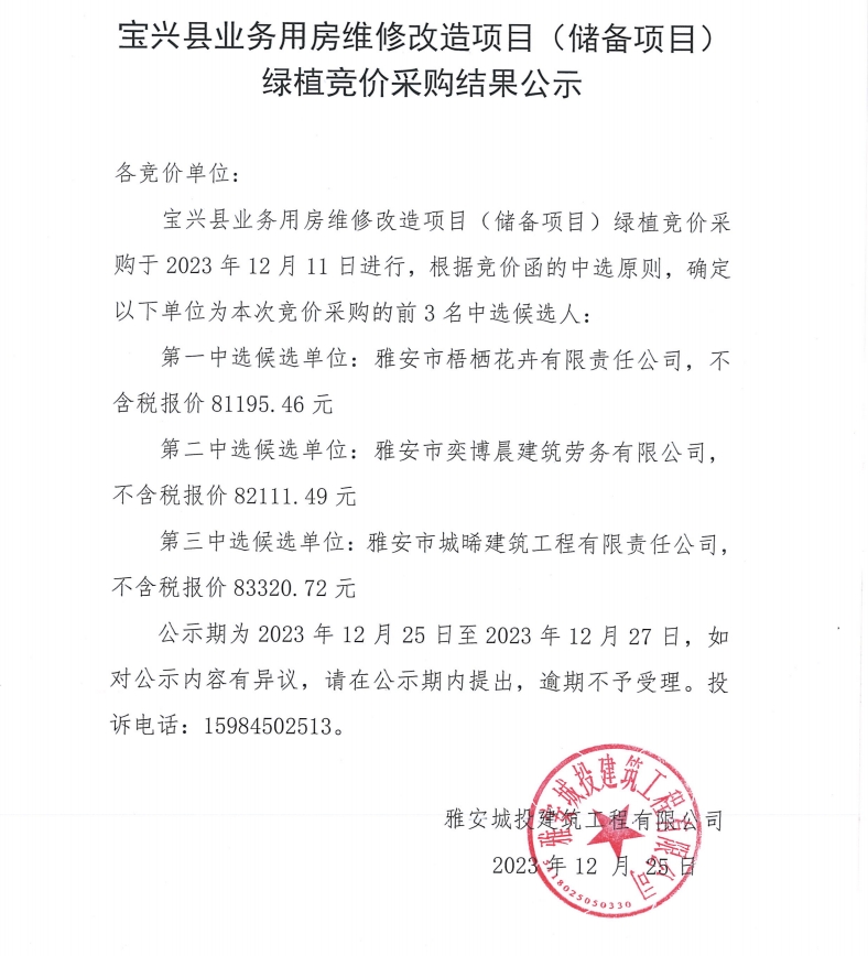 寶興縣業(yè)務用房維修改造項目(儲備項目)綠植競價采購結(jié)果公示