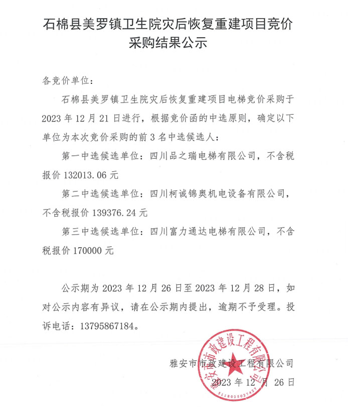 石棉縣美羅鎮(zhèn)衛(wèi)生院災后恢復重建項目競價采購結(jié)果公示
