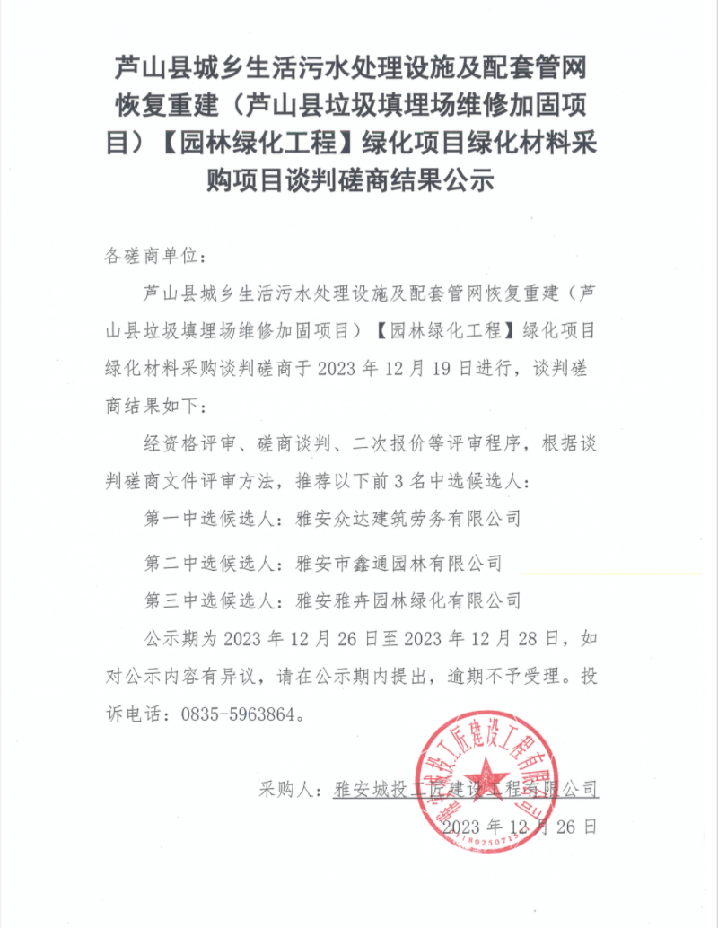 蘆山縣城鄉(xiāng)生活污水處理設(shè)施及配套管網(wǎng)恢復(fù)重建(蘆山縣垃圾填埋場維修加固項(xiàng)目)【園林綠化工程】綠化項(xiàng)目綠化材料采購項(xiàng)目談判磋商結(jié)果公示