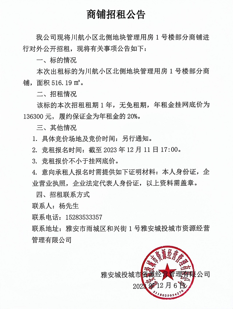川航小區(qū)北側(cè)地塊管理用房1號樓部分商鋪招租公告