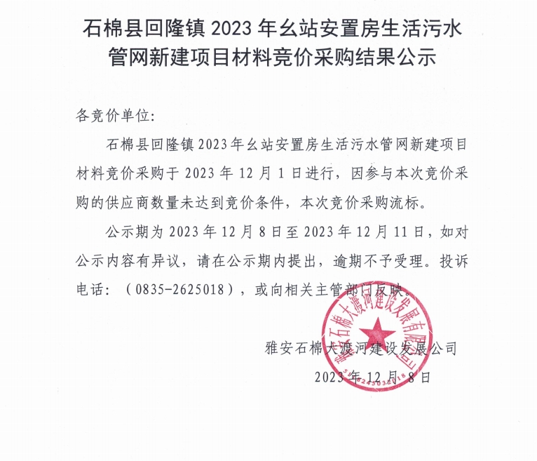 石棉縣回隆鎮(zhèn)2023年幺站安置房生活污水管網(wǎng)新建項(xiàng)目材料競價(jià)采購結(jié)果公示