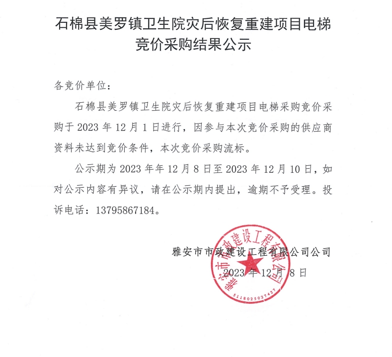石棉縣美羅鎮(zhèn)衛(wèi)生院災(zāi)后恢復(fù)重建項(xiàng)目電梯競(jìng)價(jià)采購結(jié)果公示