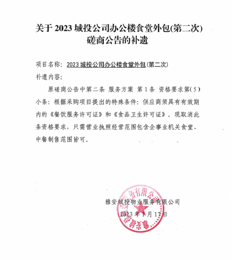 關(guān)于2023城投公司辦公樓食堂外包(第二次)項目競爭磋商公告補遺