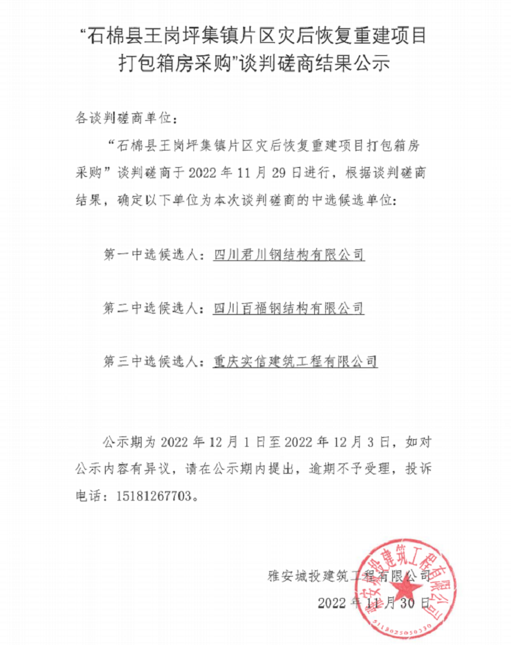 “石棉縣王崗坪集鎮(zhèn)片區(qū)災(zāi)后恢復(fù)·重建項(xiàng)目打包箱房采購(gòu)”談判磋商結(jié)果公示