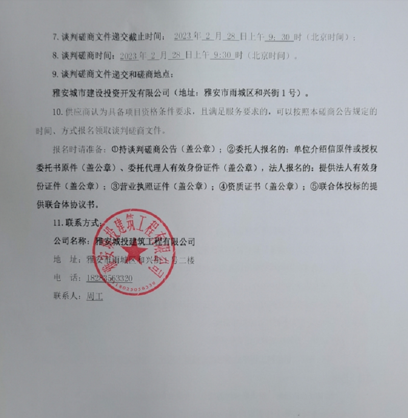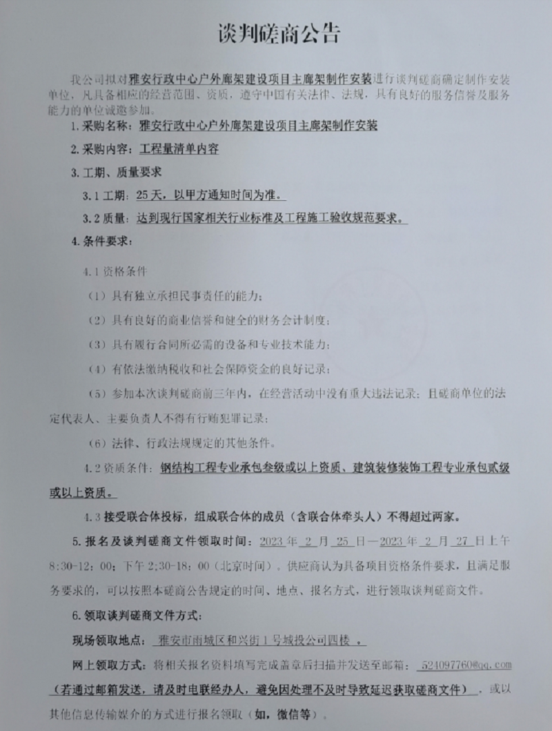 雅安行政中心戶外廊架建設項目主廊架制作安裝談判磋商公告